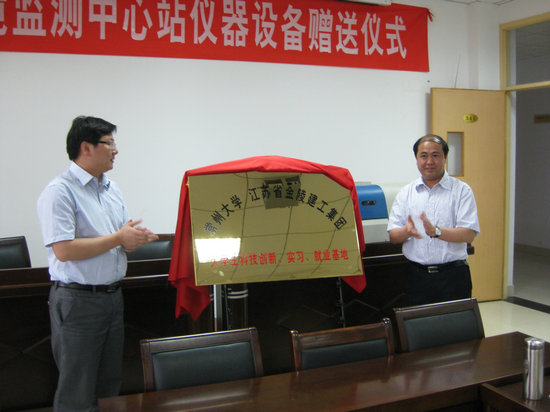 常州市环境监测中心主任蔡焕兴,常州大学资产与实验室管理处处长袁惠新为捐赠仪器揭幕。江苏金陵建工集团总经理严绍泽,环境学院院长李定龙为“常州大学-江苏金陵建工集团大学生科技创新、实习、就业基地”揭牌。