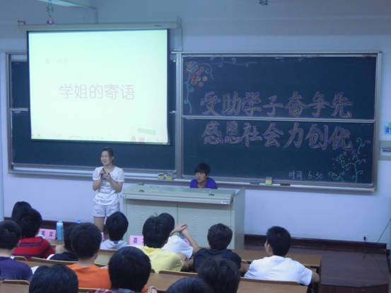 环境学院受过助学金资助的学生代表采用ppt形式,汇报了自己近一年来回馈社会的成果,学有所成的师兄师姐们用真诚的语言和亲身的经历鼓励学弟学妹们自强不息。成果汇报展上,同学们语言朴实诚恳、感情真挚细腻,“学有所成、学以致用、饮水思源、服务社会、自尊自强、创先争优”成为这些孩子最真诚的行动表达,坚韧勇敢、善良热情是这些孩子最宝贵的社会回馈。
