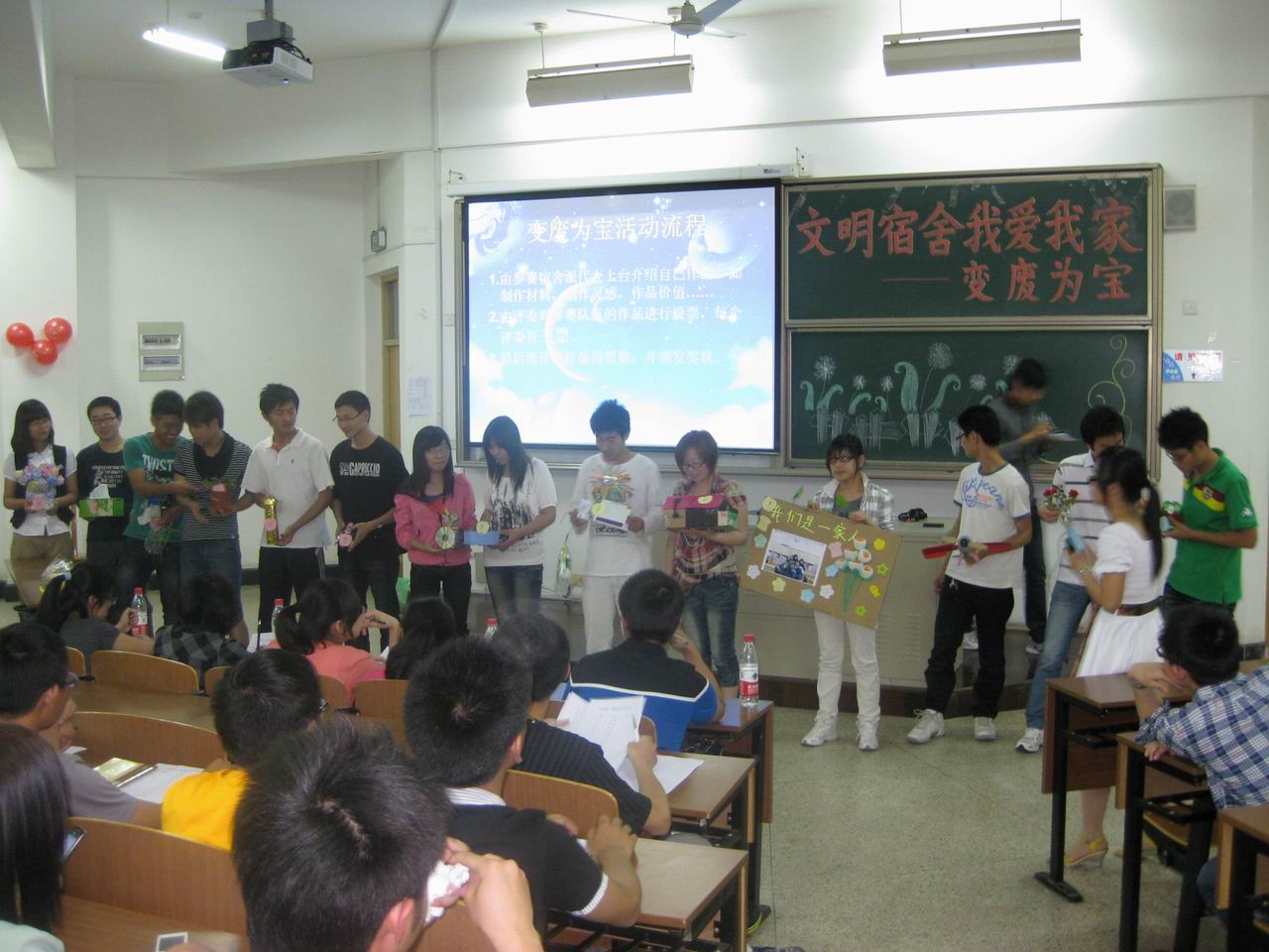 近日,由环境学院学生会主办的“文明宿舍,我爱我家”宿舍评比活动的决赛在W18阶隆重举行。继初赛的卫生文化方面的评比后,决赛项目增加了环保创意展示,要求参赛者把身边的废旧物变废为宝,突出环保理念,倡导健康生活。入围决赛的15个宿舍大胆创新,敢于实践。废旧塑料瓶、纸盒做成一件件精彩绝伦、富有创意、体现环保的工艺品,赢得了评委和现场观众的一致好评。经过严格评判,5号楼的130和131宿舍更胜一筹,荣获一等奖,比赛至此圆满结束!