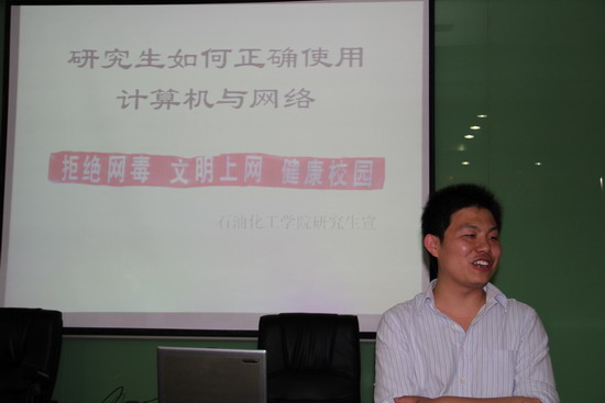 5月20日下午,在石化中心三楼会议室开展了以“拒绝网毒、文明上网、健康校园”为主题的班会,09、10级班长、团支书和辅导员老师参加了会议。