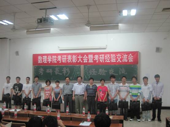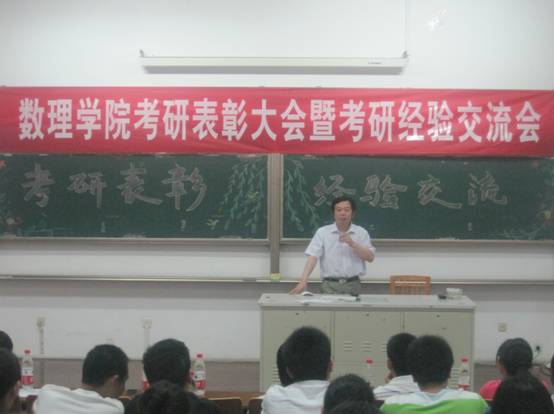 6月7日晚,数理学院考研表彰暨考研经验交流大会在w7阶隆重举行。院长孙玉强、副院长石澄贤、07级考取研究生的同学及08、09级全体学生参加了大会。会议由院党委副书记张功峰主持。