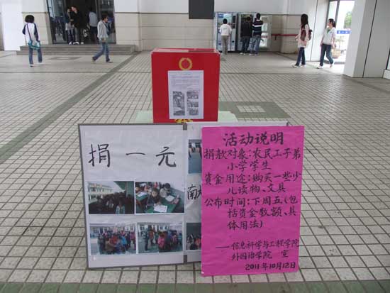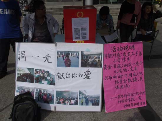 附:马家巷新市民小学是我市武进区一所外来工子弟小学,教学条件艰苦,体育器材几乎为零,信息学院团委自2007年与之共建以来,长期对其开展计算机课程辅助教学、课外辅导及捐助工作,得到了校方领导老师和学生的好评。