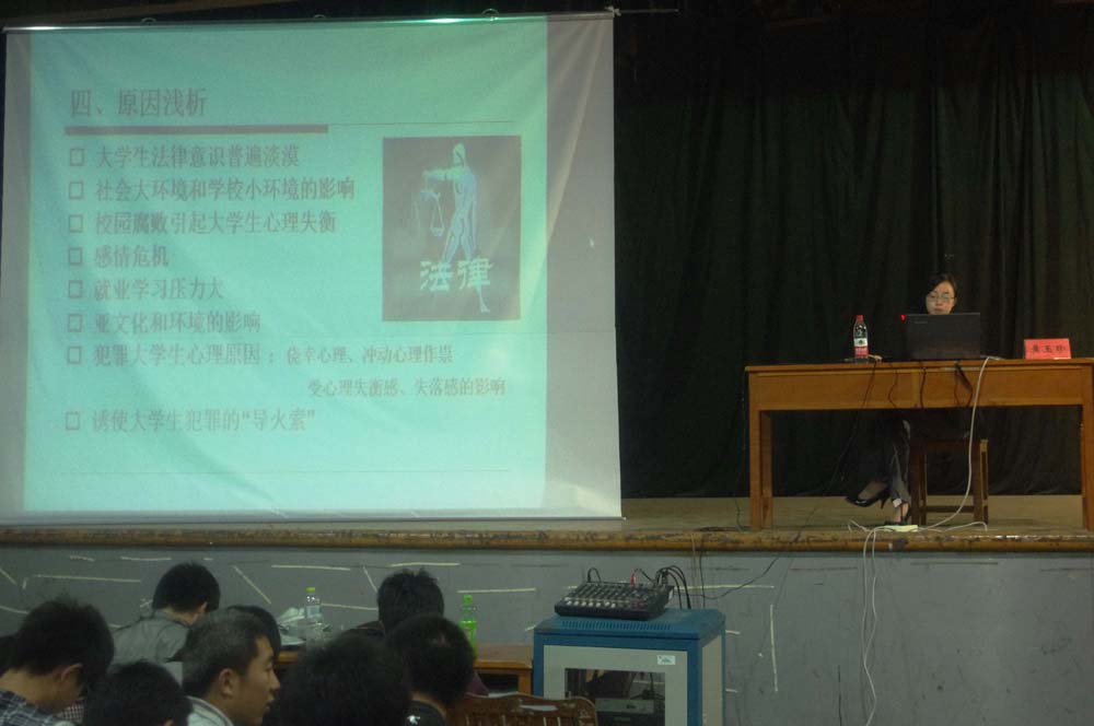 讲座中,黄玉珍律师分析了大学生犯罪的现状和主要特点,并举例论述;提出了当今大学生犯罪预防的三大措施,即注重思想道德教育、培养良好的心理素质、增强法律意识;继而讲述了大学生经常遇到的危险:传销和诈骗;最后用发生在身边的犯罪和诈骗案例,给同学以提醒和建议,并告诫同学们珍爱生命,珍惜生活。