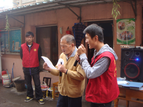 来到敬老院,志愿者们有条不紊地进行着前期准备,搭建舞台、安置音响设备、摆放座位,给老人们带来了一场别开生面的露天演唱会,从《今天是你的生日》到《映山红》,一曲曲优美动听的淳朴民歌,一首首耳熟能详的革命红歌,带动了老人们的热情,老人们也情不自禁地加入合唱,精神焕发。最后敬老院的老爷爷送给志愿者的一首《石油工人》,把整个活动推向高潮。灿烂的笑容洋溢在每个人的脸上,温馨的气氛充满了整个敬老院。