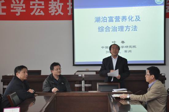 讲座开始前,李定龙院长为叶春研究员颁发了常州大学兼职教授的聘书,朱正伟书记为叶春研究员佩戴了常州大学校徽。随后,叶春研究员为该院师生作了一场题为《湖泊富营养化及综合治理方法》的学术报告。
