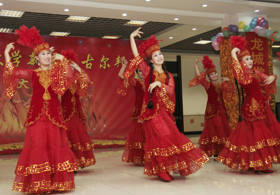 联欢会上,各族师生共同品尝着学校精心准备的民族饭菜,欣赏着由新疆班学员自排自演的精彩节目。维吾尔族、哈萨克族、蒙古族、柯尔克孜族等少数民族学员们用她们富有民族特色的歌舞打动了在场所有观众;吉他弹唱、弹布尔独奏展现了学员们的多才多艺;刚获得校园十佳歌手荣誉的新疆班学员努尔居马演唱的《无风的夜》点燃了观众热情;首批新疆班全体学员演唱的《故乡》深深的勾起所有人的思乡之情;在《哈萨克族的婚礼》短剧中,让我们近距离感受到了哈萨克族婚礼习俗及礼仪文化。哈萨克族学员加哈力拜是第一次在学校过古尔邦节,“本来以为会冷冷清清度过这个节日。没想到学校想得这么周到,让远在异地的我能过上真正的节日。没想到能和老师共同联欢,大家的热情让我感觉很温暖。”连用两个没想到形容自己的激动心情。