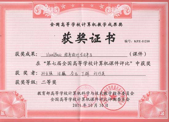 第七届全国高等学校计算机课件评比大会于2011年10月29日——30日在湖北省武汉市举行,大会由教育部高等学校计算机科学与技术教学指导委员会、全国高等学校计算机课件评比评测委员会、全国高等学校计算机教育研究会、中国计算机学会教育专业委员会、《计算机教育》杂志社举办。大会按职专类、本科类、自主学习类、教师辅助类等5类进行评比,每类评出一等奖1名、二等奖2名、三等奖4名。