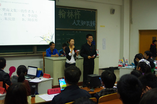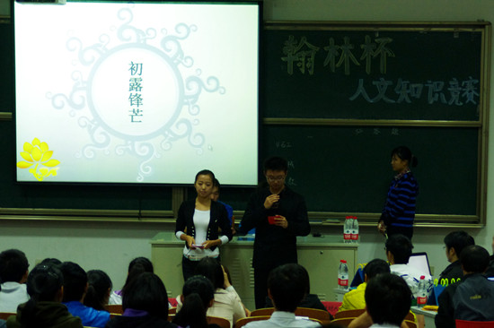 11月16日晚,由校团委主办,经济管理学院承办的第八届“翰林杯”人文知识竞赛在第一阶梯教室隆重举行,十三个二级学院代表队参加了本次比赛,每支参赛队伍由3名组员构成。现场气氛活跃,观众深受感染,跃跃欲试。