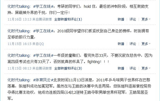 随着社会的进步与发展,人与人之间的交往日益频繁,人们对信息的需求越来越高,微博正是在这样一个大环境下应运而生的产物。石油化工学院学生工作也是秉持着与时俱进的态度,不断适应社会发展的需要,建立起一个官方半官方性质的发布学工信息的重要平台——学工微博。石油化工学院学工微博的名称为:化时代talking,设置了学工在线、学习园地、就业平台以及休闲娱乐四个板块,其运行主要由以学生为主体的微博团队进行维护,自11月9日正式上线试运行以来共发布广播43条,收听听众124人。此次石油化工学院学工微博的开通与运行旨在立足于石油化工学院广大学生群体,为学生搭建起一个自我管理、自我服务、自我交流、自我沟通的平台,同时,也与石油化工学院网站的学工信息形成互补效应,使广大同学能够及时、有效地收听与反馈学工信息。