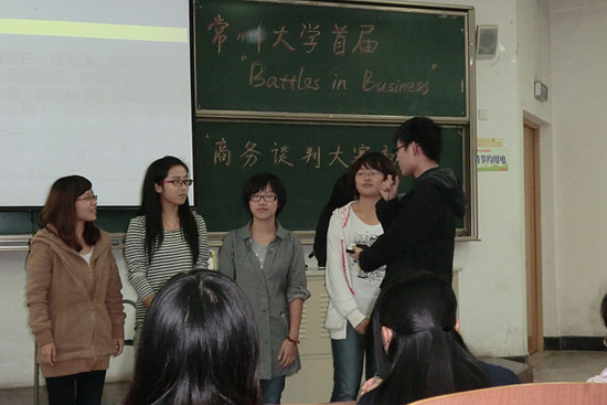 比赛有十二支队伍参加,初赛采用“情景演绎”的方式对选手进行甄选,通过抽签选取各队的商业场景,小组内分角色演绎,每支参赛队有10分钟的准备时间和5分钟的表演时间,考察参赛者对商业情景的敏感程度、英语口语能力、临场应变能力。题目涉及商务环境中的公司运作与管理、市场营销、客户服务、内部沟通等多个方面,使选手们真实体验了一把商场上智慧和胆量的交锋。经过激烈的角逐,有六支队伍脱颖而出,晋级复赛。