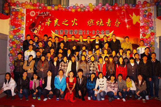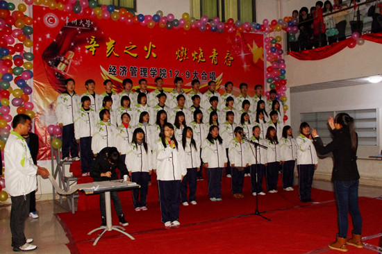 一首首脍炙人口的经典革命歌曲将活动不断推向高潮,激昂的旋律,盛大的场景,饱含深情的演唱,把全场的思绪带到了祖国几十年的奋发拼搏中,不时爆发出阵阵热烈的掌声。经过激烈的角逐,由国贸111班和工商111 班组成的代表队与物流111和物流112班组成的代表队共同摘得了桂冠。