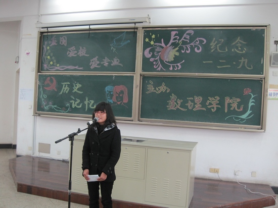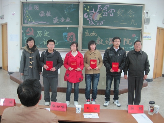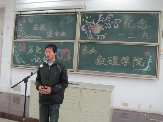 为纪念“12.9运动”76周年,弘扬爱国主义精神。12月9日下午,由数理学院团委、关工委举办的演讲比赛在16阶隆重举行。数理学院党委蒋张功峰副书记、关工委赵璧副主任、学工办常愉老师、薛峰老师及院自律中心主任唐磊同学等应邀出席并担任此次比赛的评委。
