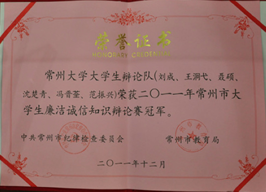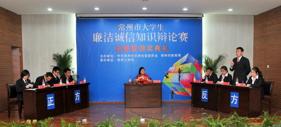 近日,常州市大学生廉洁诚信知识辩论赛在常州工学院落下帷幕,我校大学生辩论队不负众望,战胜对手夺得冠军。决赛在我校和常州机电职业技术学院的8位辩手间展开,共分9个环节,正反两方辩手分别就“廉洁诚信教育是学校教育更重要还是社会教育更重要”展开了激烈的辩论。面对对手的步步盘驳,我校参赛队员沉着应对,立论准确,条理清晰,逻辑严密,不时抛出新的观点,在第三环节对辩中,用“授之以鱼还是授之以渔”这一观点给对手形成强有力的反击,将辩论赛引入高潮。