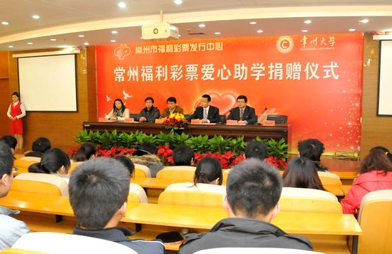 12月22日下午,2011年常州福利彩票爱心助学捐赠仪式在武进校区图书馆报告厅隆重举行。常州市民政局老龄办主任杨铁、常州市福彩中心主任葛国平、副主任殷亚波、我校副校长陈奎庆出席仪式,相关部门负责人及全体受助学生130多人参加了助学捐赠仪式,学生处处长闫海波主持仪式。