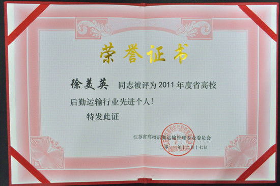 日前,在南京大学召开的2011年度江苏省高校后勤研究会运输专业委员会总结表彰大会上,我校后勤集团车队再次荣获“先进单位”称号,这是后勤集团车队继2009年后连续三年获此殊荣,徐美英同志被评为“先进个人”。