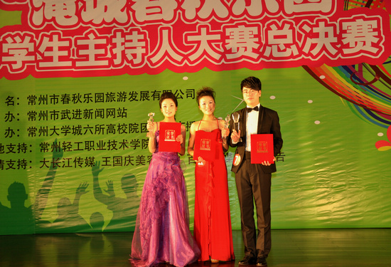 近日,由武进新闻网主办,常州大学城六所高校协办的第一届常州大学生主持人大赛在常州轻工职业技术学院千人报告厅隆重举行。由我校团委、广播站选送的高雅(国贸102班)、李浩然(土木101班)、刘静(通信111班)三位选手从200多名报名者中一路过关斩强,经过初赛、复赛,最后进入总决赛。