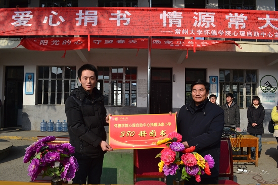 怀德学院大学生心理自助中心支援汤家小学图书捐赠仪式于近日在汤家小学举行。汤家小学校长姚尚文及全体师生、怀德学院心理健康辅导站毛诚著老师及自助中心骨干成员出席了本次仪式。