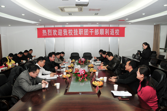 校党委组织部龚方红部长致辞欢迎三位同志圆满结束挂职工作顺利回到学校,感谢他们不畏艰难、迎难而上,以高度的事业心、责任感和饱满的热情圆满完成了各项任务,为地方共青团的建设做出了积极的贡献,搭建了学校对外合作平台、宣传了学校办学成就、扩大了学校的知名度。