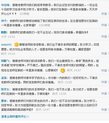 我校学生也积极与关工委的老教师们进行互动,他们通过学校微博和石油化工学院学工微博等方式对老教师们的新春祝福表示感谢,祝愿他们身体健康,并谨记老教师们的教诲,努力学习,不断提高和充实自己,在未来取得更大的进步。