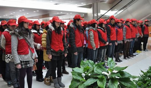 制药学院2011级学生身着统一红色志愿者马甲,以整齐的形象和饱满的精神展现了制药学院良好的风貌。