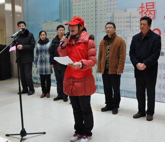 护理111班杨飞同学作为大学生志愿者代表做了发言,她回顾了今年寒假期间在二院参加“导医”活动时的过程与收获,获得了大家热烈的掌声。常州大学团委牟静书记、制药与生命科学学院团委书记刘荣老师以及护理班班主任老师到场。此次把常州市第二人民医院设立为常州市大学生志愿者实践基地,必将丰富常大学子的志愿者活动,为提高大学生的综合素质打下坚实基础。