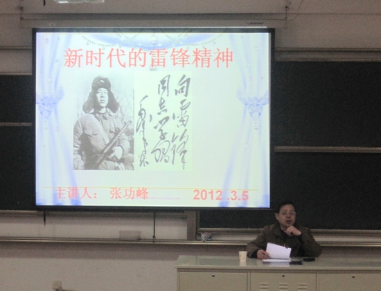 启动仪式上,数理学院党委副书记张功峰老师作题为“新时代的雷锋精神”主题报告。张功峰副书记指出,我们举行“学习雷锋在行动”主题活动启动仪式,目的是积极与正在召开的两会以及即将召开的党的十八大相呼应,深入开展学雷锋活动,大力弘扬雷锋精神,促进社会主义核心价值体系建设,不断提升全院师生的道德素质和文明程度。他指出,深入开展学雷锋活动,大力弘扬雷锋精神,要突出五个方面:一是要学习、实践、弘扬雷锋同志热爱党、热爱祖国、热爱社会主义的崇高理想和坚定信念;二是要学习雷锋同志服务人民、助人为乐的奉献精神;三是要学习雷锋同志干一行爱一行、专一行精一行的敬业精神;四是要学习雷锋同志锐意进取、自强不息的创新精神;五是要学习弘扬雷锋艰苦奋斗、勤俭节约的创业精神。最后,张书记宣布“学雷锋”主题活动正式启动。