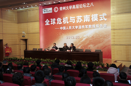 3月9日下午,常州大学高层论坛第八期暨姬山讲坛开坛仪式在文彰楼报告厅隆重举行,中国人民大学农业与农村发展学院院长、中国人民大学可持续发展高等研究院院长温铁军教授为我校师生作了题为“全球危机与苏南模式”的报告。我校党委书记史国栋致欢迎辞,校党委副书记孙小强、副校长王卫星出席报告会,常州市委市政府、武进区区委区政府相关部门的领导、企事业单位、部分媒体记者和我校教师代表参加报告会。300多名学生聆听报告。报告会由校党委副书记孙小强主持。