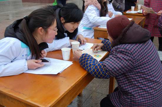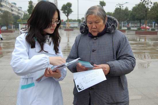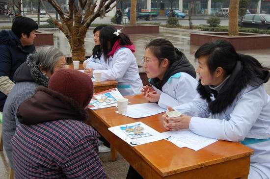 来自外语学院与制药学院的10名志愿者,身穿洁白护士服,不惧寒冷,用热情与微笑为前来咨询的附近居民提供周到细致的宣传与咨询服务。同时志愿者们也向前来咨询的群众发放女性健康知识宣传册,制作精美的宣传册上的健康知识简单、实用、易懂。10名志愿者充分运用自己的课堂知识,针对群众咨询问题,逐一耐心解答。热情周到的宣传和咨询服务,简单实用的健康小常识赢得了前来咨询的社区居民和社区居委会领导的一致赞赏。