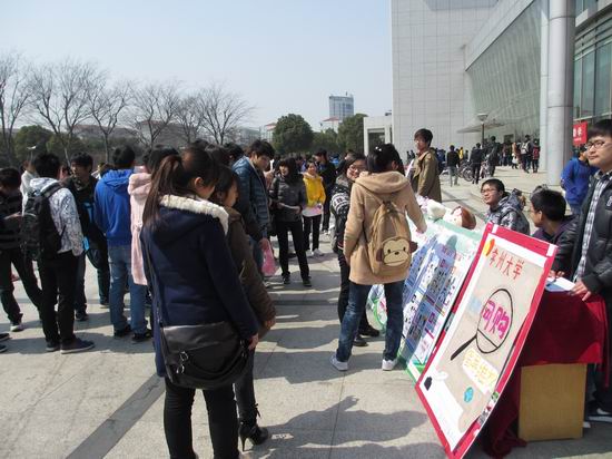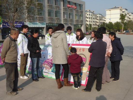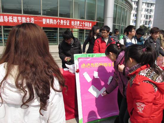 3月12日至15日,环境学院的志愿者们在学校以及周边社区附近拉起横幅,发放传单,通过用网购中索取的发票换取小礼品、问卷调查等形式,向学生和市民们宣传安全消费,此举得到众多学生和市民的积极响应。一位学生在接受采访的时候说道:“网购索要发票,这我之前从来没想过,身边的人也都没这个意识。”