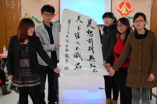 交流活动在轻松愉快的氛围中拉开了帷幕。两院学生会主席分别通过PPT演讲的形式详细介绍了各自学院学生会的机构组成和分工职责以及一些大型活动的组织策划过程。通过介绍,两院学生干部彼此间有了初步了解。随后的分组讨论中,两院学生会对应部门的主要负责人就本部门的管理模式、职能发挥等方面的话题做了详尽交流。大家畅所欲言,气氛活跃。活动最后,两院学生代表还分别进行了精彩的才艺表演。活动结束之际,外国语学院学生会将书法作品“莫愁前路无知己,天下谁人不识君”作为礼物送给了江技师外院学生会。