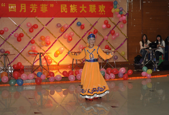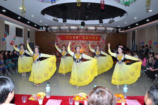 新疆班同学的四人舞——《赛马》拉开了联欢活动的序幕,奔放有力的舞姿、浓郁热烈的新疆风情迅速感染了全场观众。热力四射的悠悠球、轻松风趣的相声、活力动感的街舞、清远悠扬的小提琴演奏、回味绵长的民族舞蹈,使各民族师生多元文化联欢的激情达到沸点。校园十佳歌手第三名努尔居马同学一曲《美丽的嫂子》更是唱得热情豪迈,将联欢会推向了高潮。在联欢过程中,维吾尔族、哈萨克族、蒙古族和回族等民族的学生代表分别走上舞台,介绍了各自民族的风情习俗,并与现场观众分享了手抓饭和奶茶等民族特色食物。