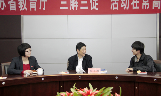 调研中,朱卫国副厅长对我校以人为本的学生工作给予了充分的肯定,对我校开展的学业生涯规划、大学生就业创业、学生社团工作给予了积极的评价。朱卫国副厅长表示,教育厅会一如既往地关心和支持我校各项事业的发展,对学校所反映的发展困难将进行汇总并研究对策。他希望我校进一步做好学业生涯规划和就业创业教育工作,继续推进心理健康教育和辅导员队伍建设,培养出更多优秀的高层次人才,以更高的工作成效和更优异的办学成绩为江苏经济建设及社会发展贡献力量。