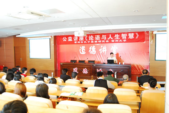 2012年4月14日上午9点,由常州大学与常州市孔子思想研究会共同举办的“传统文化大讲堂”活动在“常州大学道德讲坛”报告厅正式启动。开展该活动的目的在于传播中国传统文化,推进常州市“道德讲堂”深入大学校园,加深广大青年学生及常州社会各界人士对中国传统文化的了解。常州市孔子思想研究会部分会员、民进常州大学支部会员,校党委宣传部负责人以及文法与艺术学院部分师生参加了活动。报告会上,原校党委副书记王凯全致欢迎辞,常州市孔子思想研究会副会长缪向东先生作《论语与人生智慧》的报告。