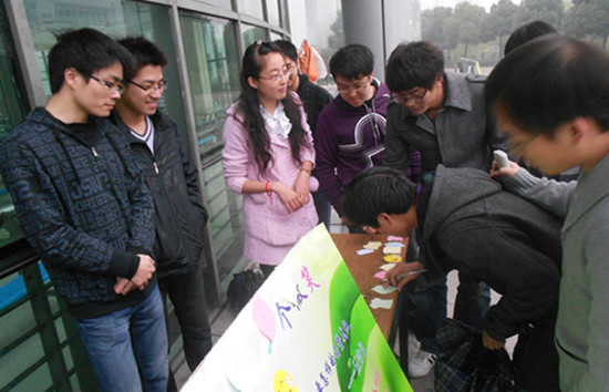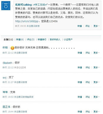 为引导学生欣赏自己、赞美他人、感恩社会,石油化工学院开展了形式多样的以赞美为主题的活动。在学院心理委员共同策划和组织下,该院10级学生开展了“一次赞美,一个微笑”的主题活动。在活动初期,各班级心理委员负责收录班级同学对他人的赞美之音,欣赏自己或他人的话语。经过对收集来的原始音频进行后期处理,将整理剪辑出的“赞美之音”,在水月广场通过音箱设备播放,并同时将其发布在 “化时代”微博这一全新的话语平台上,让更多的同学收听和关注。