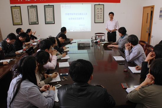 4月24日下午,在八楼会议室S822,怀德学院组织全体辅导员进行了学生就业工作业务知识的专题培训。培训邀请了学生处就业服务中心副主任周屹峰老师主讲,由学工办主任吴青玲老师主持。