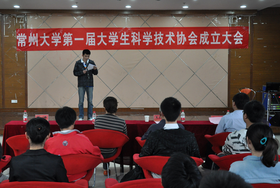 王正洪教授为科协成立致辞,他对我校更名后第一届大学生科协的成立表达了热烈的祝贺,同时提出了大学生科协工作开展的新形势、新领域和新思路,为活动组织和科协的发展提供了宝贵的建议。第一届科协主席齐大谦宣读了《常州大学大学生科学技术协会章程》,并代表校科协筹备组作了筹备工作报告,对科协成立的筹备工作做了总结,对科协近期总体工作做了部署。校科协主席团其他成员分别就各部门的具体工作思路、计划和目标进行了汇报。最后,校团委牟静书记对校科协的工作提出了具体要求,指出校科协要以构建全校学生创新体系、培育学生创新人才、孵化学生创新成果为目标,要加强全校学生科协组织的合作与指导,实现创新资源的共享,要热心为同学服务,在全校营造“崇尚科学、勇于创新、投身实践、追求卓越”科技创新氛围。