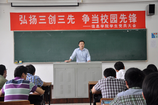 会上,储志新副书记传达了校党委组织部关于《弘扬三创三先,争当校园先锋》的统一整体部署,要求全体学生党员积极贯彻执行。储志新副书记结合近段学院开展的创先争优和学风建设活动指出当前部分学生党员存在着先锋模范发挥不明显、工作方法不灵活等问题。