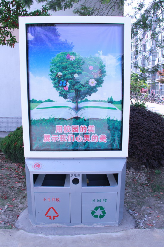 我校首批带有公益环保宣传的垃圾回收箱,经过选址摆放、固定及近一周时间的安装,现已投入使用。新型的垃圾回收环保箱造型上更加整洁、美观,两个分类投掷箱还区分了“可回收垃圾”和“不可回收垃圾”,同时增加了“废旧电池回收”区域,受到了很多热心环保师生的认可。