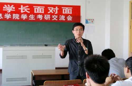 来自08级考研成功的学长分别从报考学校的选择、专业的选择、考研期间的复习计划、各门课程的复习技巧以及进入面试后应注意的事项等几方面进行了详尽的介绍。学长们还结合自身的实例向大家分享了各自的经验。明确目标不动摇,然后将目标细化,每天都坚持完成任务。复习中不仅要积累学习经验,掌握学习技巧,更要以平常心态看待考研,考研提高的不仅仅是自己的学识,同时更磨砺了自己的意志。
