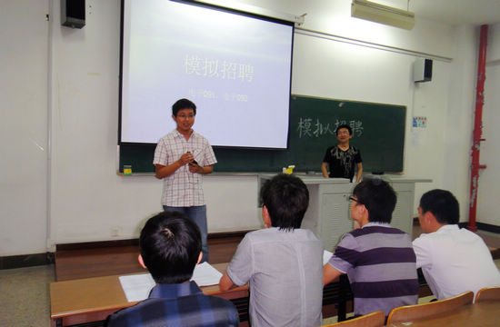 各班级模拟招聘活动邀请了辅导员和学院已经签约就业的大四学生作为招聘考官。低年级学生积极主动和模拟招聘官们交流,不仅是认真回答招聘官的问题、而且还通过交流大量获取求职就业的宝贵经验。“怎样才能够赢得招聘官的青睐?怎么样才能尽量简洁描述又能表达条理清晰?”在模拟招聘中这些问题得到了很好的回答,低年级学生从学长那里得到了宝贵经验,也增强了对未来就业的自信心。