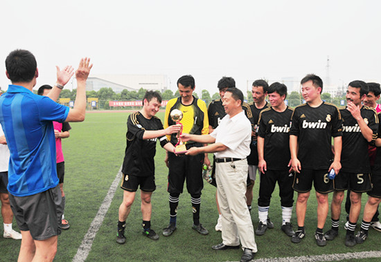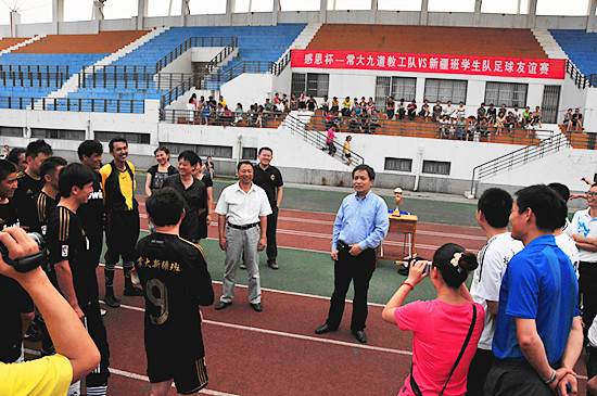 九道教工队与新疆班队举行“感恩杯”足球友谊赛 校工会主席袁能讲话 新疆班领队赵保平为新疆班队颁发“感恩杯”奖杯