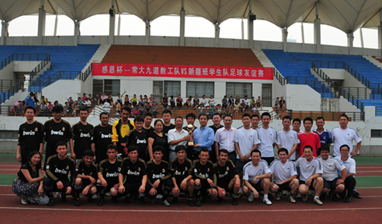 6月8日下午3点,九道教工足球队与新疆班“感恩杯” 足球友谊赛在武进校区体育场举行,校工会主任袁能,新疆班领队赵保平、副领队章晓霖,新疆班足球队和九道教工足球队全体成员参加活动。
