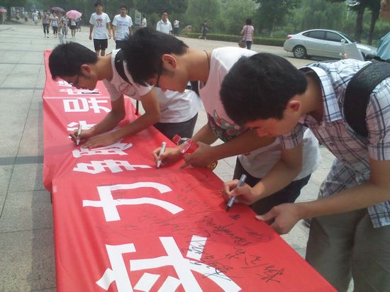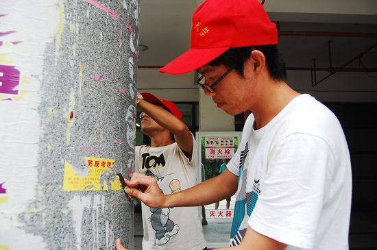 校学生会、社联、自律中心等学生团体自发组织了清除校园小广告活动,净化考试环境,并在水月广场进行众人签名活动,倡导公平诚信,呼吁广大考生自觉抵制考试作弊。