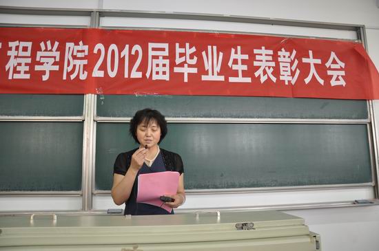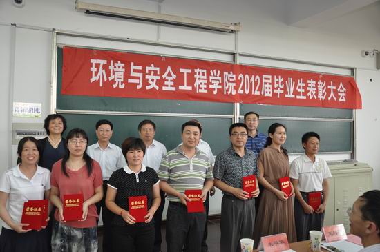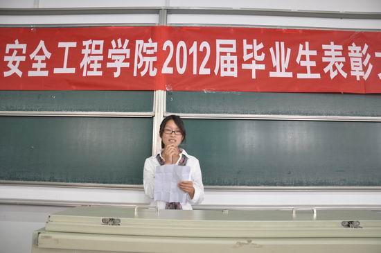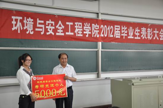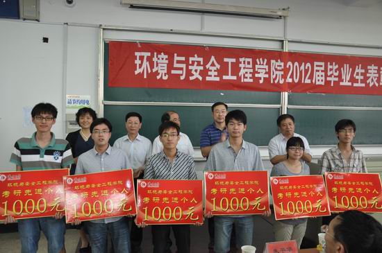 会上,朱正伟书记宣读了《关于表彰2012届考研先进集体和个人的决定》。希望受到表彰的先进个人,继续发扬勤奋学习、刻苦钻研的好学风,到新学校争取更大进步,为母校争得更大的荣誉,希望09级即将考研的同学们,拼搏进取,争取取得更加辉煌的成绩。王利平副院长、张凤娥副院长分别宣读了《2011年江苏省高校本科毕业设计(论文)评优与抽检表彰决定》和《关于表彰环境与安全工程学院2012届十佳论文的决定》、《关于表彰环境与安全工程学院2012届优秀毕业设计指导教师的决定》,并对获奖师生进行了颁奖。给水082班今年考上浙江大学的尚淑丽同学代表受表彰同学发言,并介绍了自己的考研经验和体会。