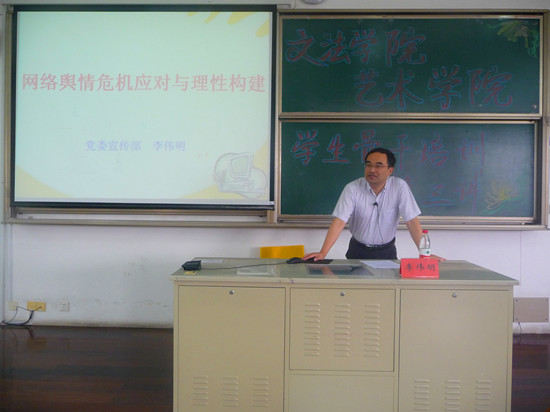 6月28日至7月1日,文法学院与艺术学院对2010级、2011级学生骨干进行了专业培训,讲座分别邀请到学院党委书记胡学琦,校党委宣传部部长李伟明,后管处、保卫处副处长秦义等校内专家。文法学院与艺术学院全体学生工作老师参与了本次系列讲座。