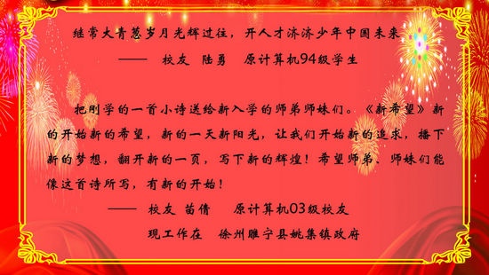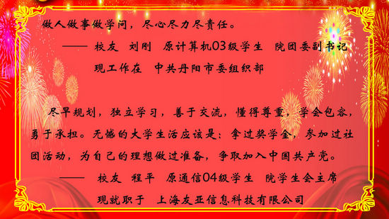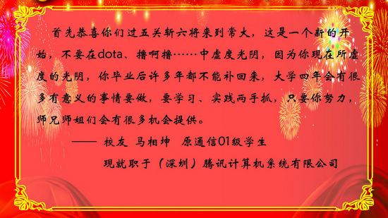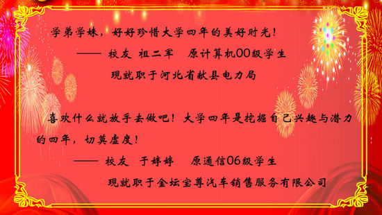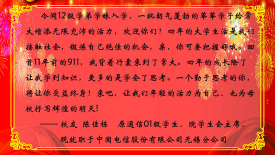 在学校喜迎2012级新生入学之际,信息学院部分校友也从全国各地送来了他们衷心的祝福,在祝贺2012级学弟学妹们考入常州大学的同时,还结合自己在大学里的学习、生活经验和进入社会工作后的感受寄语学弟学妹,希望学弟学妹好好珍惜大学生活,规划好自己的学业,踏踏实实,一步一步走向成功。