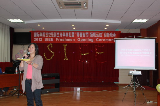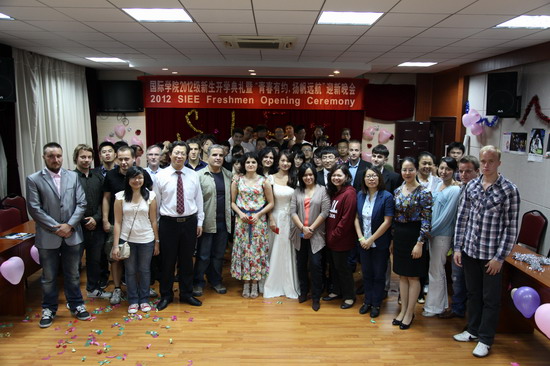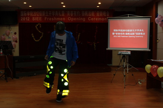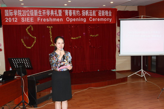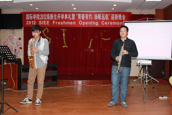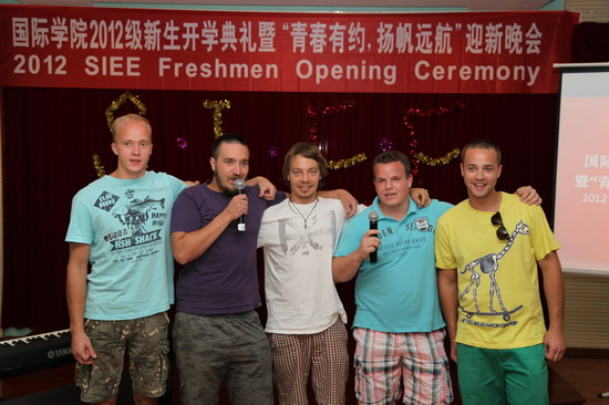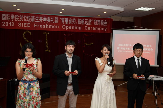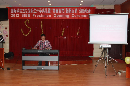 晚会在包括伊朗和土库曼斯坦留学生在内的四位主持人的祝福声中开始,随后,12级新生姑娘们用华丽的开场舞《Goodbye Baby》拉开了序幕,在动感的音乐中,舞姿让一开场的气氛就很高涨。随后学院党总支书记杨琳致辞,表达对12级新生的殷切期望,希望大家谨记院训“Prepare the best,Enjoy the most”,并将其落实到行动中去。外教Rezen的发言、外教Donald的吉他独奏《Titanic》让晚会气氛持续高昂。艺术无国界,在中国生活多年的Donald,用他深情的独奏为在场的学院学生和境外交流生搭建起心灵的桥梁。随后的外教、交流生与新生的互动环节让整场晚会气氛达到高潮。在学院学生的表演中,无论是歌曲《爱我的人和我爱的人》,钢琴独奏《晓风之舞》,还是小品《白雪公主2.0》,都充斥着欢声与笑语,此次晚会芬兰留学生也给我们带来了异国歌曲《Finland national song》,在合作院校读书的圣大和梅大学生也带来了对2012级新生的深深祝福,这些都坚定了同学们发奋刻苦、努力跨境深造的决心和信心,优秀学长代表,现就读于加拿大皇后大学硕士研究生的江卫杰同学也来到现场给新生带来温馨祝福。此次开学典礼暨迎新晚会不仅为在场所有同学带来一场视觉与听觉的盛宴,更为境外交流生和新生提供了一个交流沟通和展示的平台。