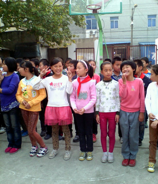 在东庄新市民小学,志愿者和孩子们一起做户外拓展小游戏