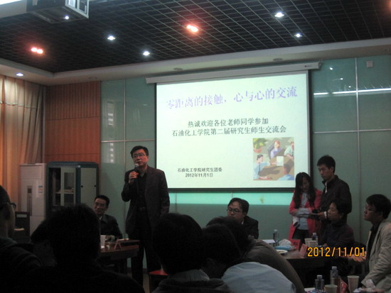 研究生部陈若愚副部长在讲话中肯定了本次交流会的积极意义。并对石化研究生提出来要求,希望大家认真做好研究生三年的学业规划,提升自己各方面的综合能力,为今后的发展打下更为坚实的基础。