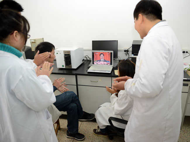 学生在实验室收看十八大开幕式盛况